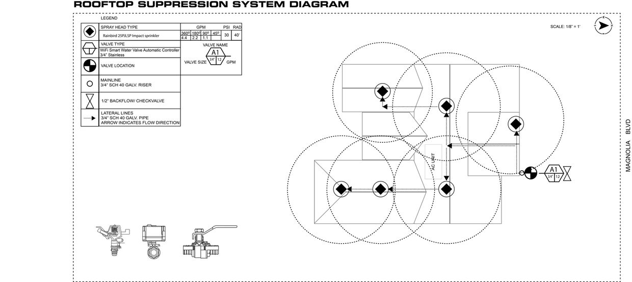 H2OUSE GUARD suppression systems are designed to provide the best possible coverage with the most efficient distribution of water for your specific application. We survey the roof and produce a detailed diagram of your system to ensure a clean and efficient install. The basic analog system can be installed usually in a day.
